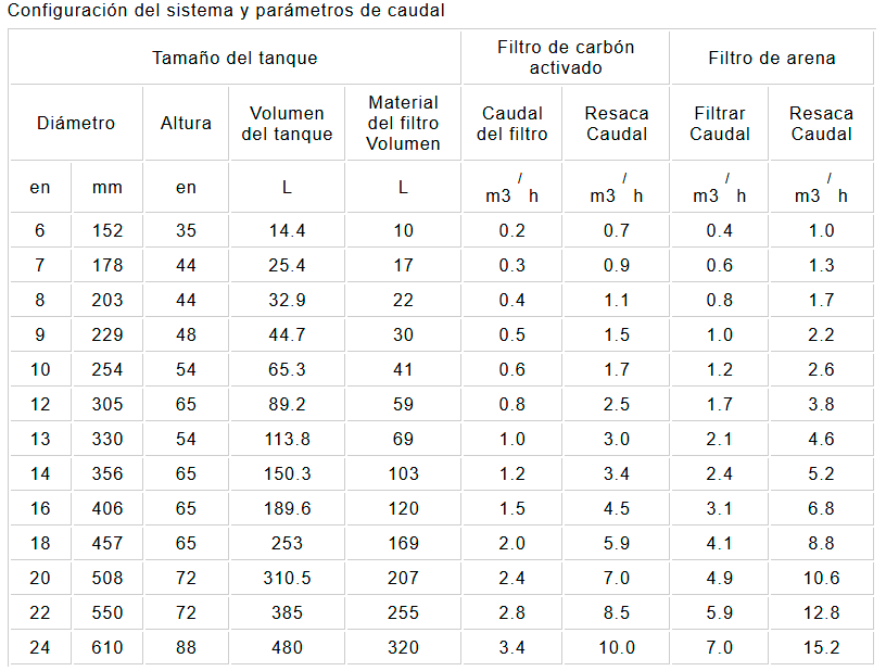 El caudal del filtro de arena indicado corresponde a una velocidad de flujo de 25 m/h.