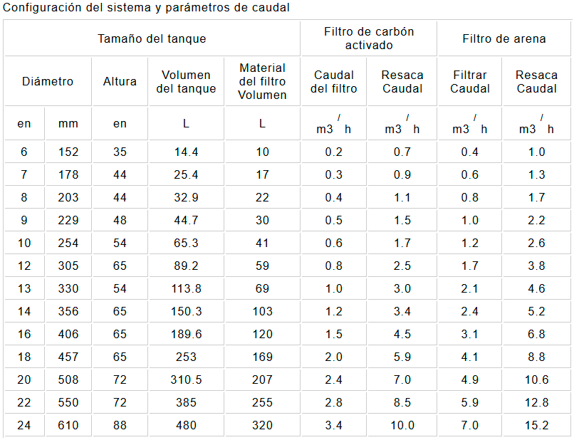 El caudal del filtro de arena indicado corresponde a una velocidad de flujo de 25 m/h.