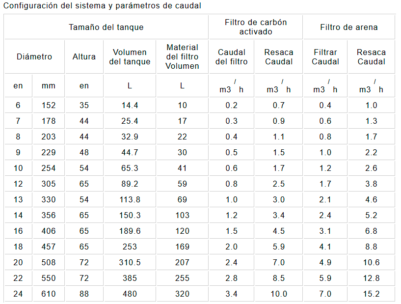 El caudal del filtro de arena indicado corresponde a una velocidad de flujo de 25 m/h.