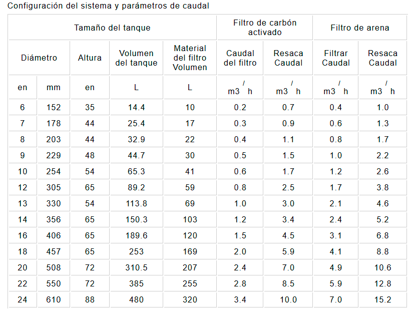 El caudal del filtro de arena indicado corresponde a una velocidad de flujo de 25 m/h.